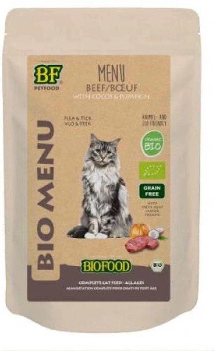 Biofood Organic bijvoeding voor Kat 100% Rund Menu Biofood Organic Rund menu is biologisch, graanvrij natvoer voor de kat en bestaat uit 100% biologisch vlees en biologische groente, een complete maaltijd. Met dit smakelijke voer van Biofood biedt u uw kat de beste natuurlijke voeding, die ook nog dier- en milieuvriendelijk is. Biofood Organic Rund Menu is natvoer in pouch, samengesteld uit gecertificeerde biologische grondstoffen van biologische boeren. Het voer bevat één dierlijke eiwitbron, is hypoallergeen en is zeer goed verteerbaar. De hoge voedingswaarde zorgt voor een verzadigd gevoel en minder ontlasting. Voor een blije kat met een gezonde huid, vacht en een goede vertering! Dit voer is graanvrij én samengesteld zonder toevoegingen zoals kunstmatige vitaminen, bindmiddelen, zout, suiker of andere geur-, kleur- en smaakversterkers. Voor een beter milieu en dierenwelzijn is dit voer bovendien ontwikkeld zonder dierproeven en CO2-neutraal en met e