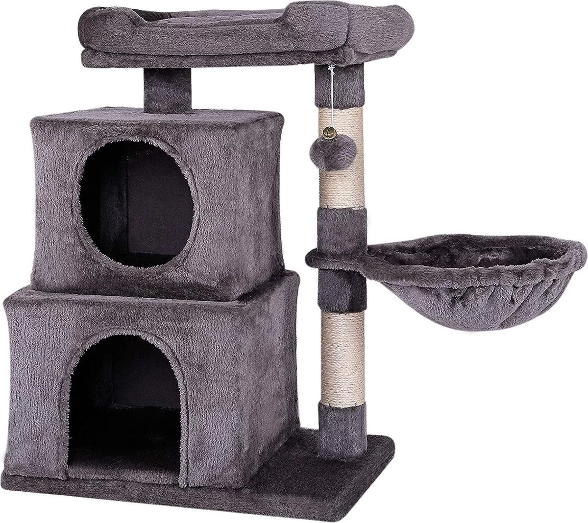 - Ideaal speel- en rustparadijs. De voortreffelijke uitrusting van deze kattenboom met 2 grotten en een pluche bal met belletjes voldoet aan de speeldrive van je kat. Het gezellige ligbed en de ligbak ondersteunen bovendien de benodigde rustfasen en ook het populaire observeren komt niet te kort. De perfecte balans tussen speelplezier en terugtrekmogelijkheden.