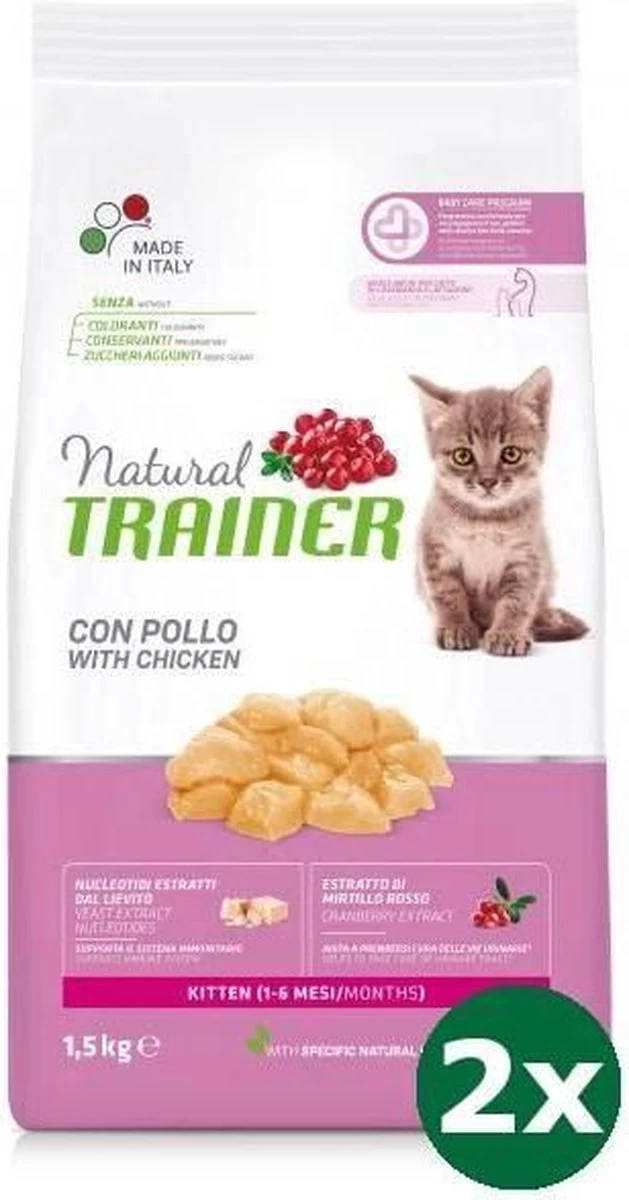 Natural Trainer Cat Kitten Chicken 1,5 kg De Natural Trainer Cat Kitten Chicken 1,5 kg is een hoogwaardig volledig droogvoer voor kittens en jonge katten tot zes maanden met kip en cranberry, voor een sterk immuunsysteem, een goede ontwikkeling en gezonde urinewegen. Nature meets science! Dat is het motto van het hoogwaardige voer van Natural Trainer. De voedingen van Natural Trainer maken gebruik van de natuurlijke kracht van eiwitten, groenten, fruit en planten op basis van wetenschappelijk onderzoek. Dit smakelijke voer is daarom bereid met verse kip en cranberry-extract voor gezonde urinewegen. Veel katten krijgen last van blaasproblemen en cranberry beschermt hiertegen, omdat het extract voorkomt dat bepaalde bacteriΓ«n zich in de urinewegen kunnen vasthechten. Ook draagt de uitgekiende samenstelling bij aan een goede vertering door de mix van MOS en inuline en zorgen de smaak en structuur voor een hoge acceptatie, ook bij moeilijke eters. De nuc