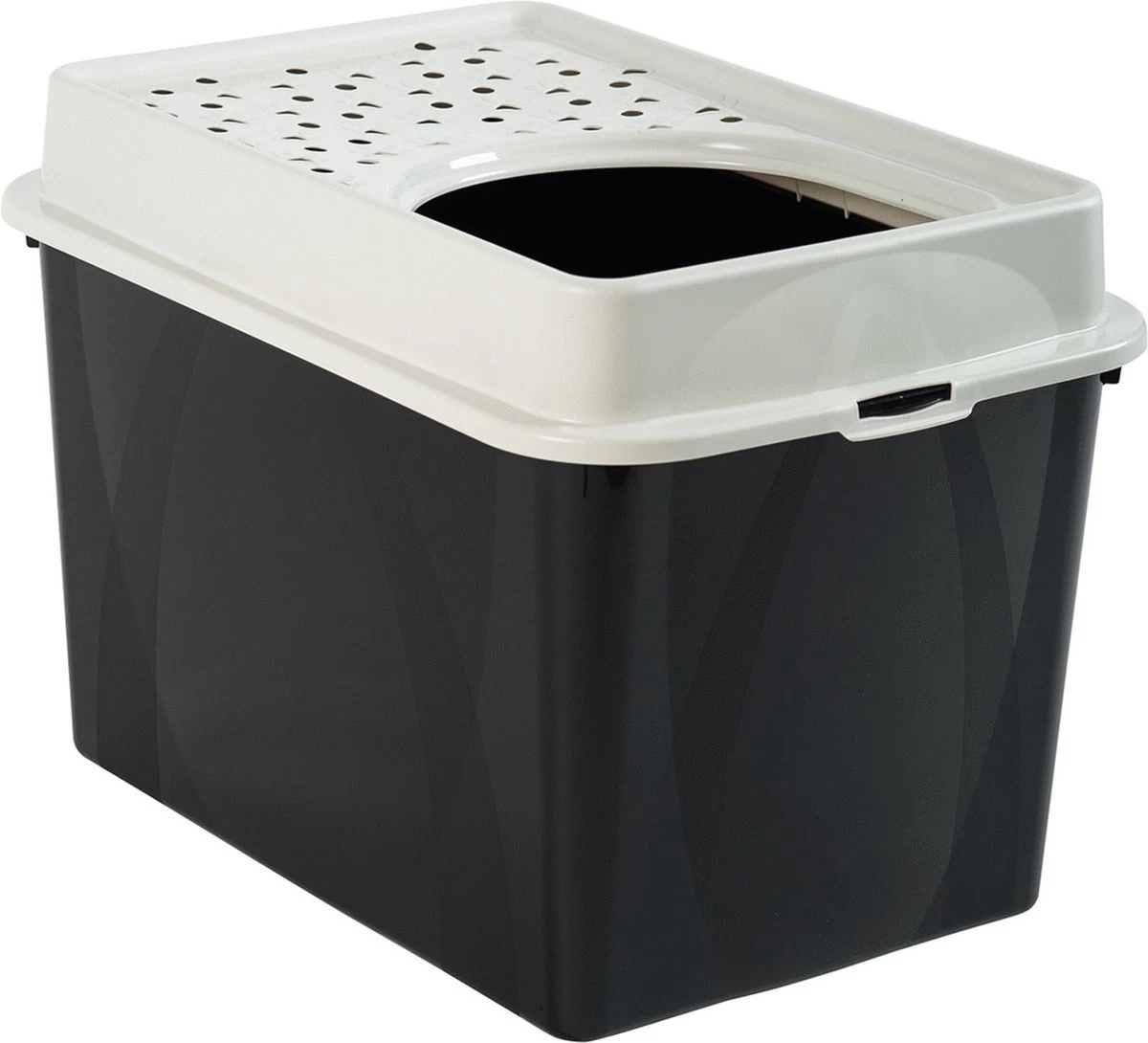 Een kattenbak in hedendaagse stijl met een boven ingang. Ook geschikt voor de grotere rassen kat door de ruime opening. De kattenbak is breed en diep, zodat elke kat daar zijn/haar plekje vindt. De hoge zijkanten garanderen dat minder ontlasting en beduidend minder kattengrit buiten de kattenbak terecht komt.