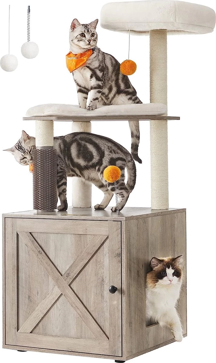 [2-in-1 kattenhuis] Krabpaal en kattenbakkast in één – een kattenmeubel om aan de verschillende behoeften van uw katten te voldoen. Met een afmeting van 52 x 52 cm past hij perfect in kleine hoekjes – een echte ruimtebespaarder