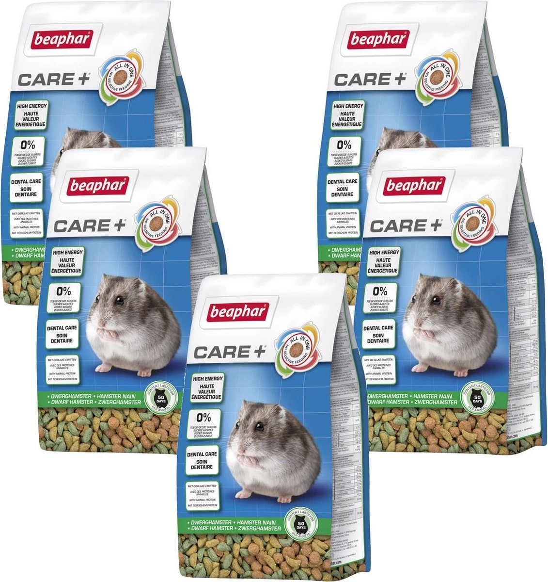 pstrongVolledig diervoeder voor dwerghamsters./strongbrbrCare+ Dwerghamster is een zeer smaakvolle super premium voeding. Het is ontwikkeld in samenwerking met dierenartsen en voedingsdeskundigen. Care+ is geëxtrudeerd, deze hitte behandeling maakt een betere vertering van eiwitten uit het voer mogelijk. De ingrediënten zijn afgestemd op de voedingsbehoefte en benaderen het natuurlijke voedingspatroon. Ieder brokje bevat dezelfde samenstelling (All-in-One), met als resultaat: geen selectief eetgedrag, geen restjes en geen tekort aan voedingsstoffen. De harde brokjes ondersteunen de natuurlijke slijtage van de tanden (Dental Function). De brokjes bevatten verder een uitgebalanceerde verhouding van de meervoudig onverzadigde vetzuren Omega 3 & Omega 6 (uit maïs, tarwe, soja en vlaszaad), met vitamine E voor de lichaamscellen, met dierlijke eiwitten en smakelijke kruiden. Met Care+ heeft u absoluut het beste voor uw dwerghamster in handen.brbrSamenstelling:brGranen, plantaardige bijproducten, vlees en dierlijke bijproducten, zaden, mineralen, plantaardige eiwitextracten, Yucca Schidigera, algen (Spirulina 0,01%).brbrAnalytische bestanddelen:brRuw eiwit 20,5%, ruwe celstof 9,6%, ruw vet 5,9%, ruwe as 5,2%, Ca 0,91%, Mg 0,22%, Na 0,21%, K 1,01%, P 0,69%.brbrToevoegingsmiddelen:brNutritionele toevoegingsmiddelen: Vitamine A 14200 IE, Vitamine D3 2000IE, Vitamine E 67,5 IE, Vitamine C 12mg, Vitamine K 4,9mg, Vitamine B1 44,4mg, Vitamine B2 27,5mg, Vitamine B6 36,6mg, Vitamine B12 61?g, Niacine 89mg, pantotheenzuur 47,5mg, biotine 613?g, foliumzuur 3,6mg, choline 1159mg, E1 44,6mg, E2 10,6mg, E4 6,6mg, E5 11,1mg, E6 27,9mg.brAntioxidanten, kleurstoffen.brbrVoedingsadvies:brCare+ wordt direct geaccepteerd. Het is echter zeer belangrijk om geleidelijk naar een nieuw voer over te schakelen. De eerste dagen kunt u Care+ dan ook het beste mengen met het oude voer. Een dwerghamster eet gemiddeld ongeveer 5-15gr Care+ per dag, Geef voer bij voorkeur in de avond. Geef iedere daf schoon en fris drinkwater!/p